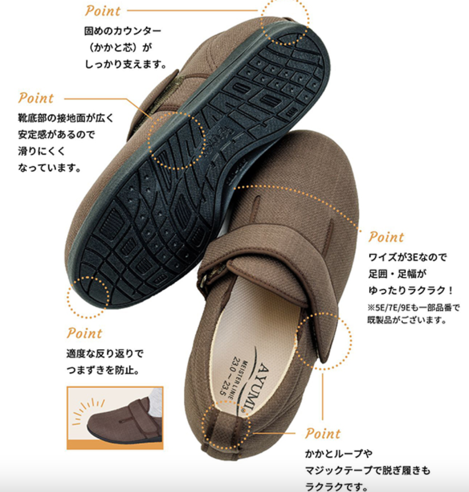 そのため、長時間の歩行には紐靴、入院中や施設内での使用には脱ぎ履きが容易な靴というように、シーンに合わせて使い分けることをお勧めします。